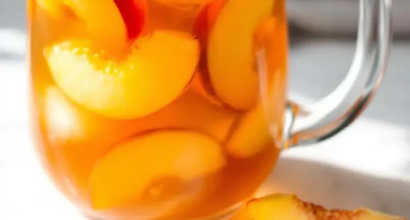 Peach slices release a juicy, fragrant aroma as they soak, making the drink smell like summer in a glass.