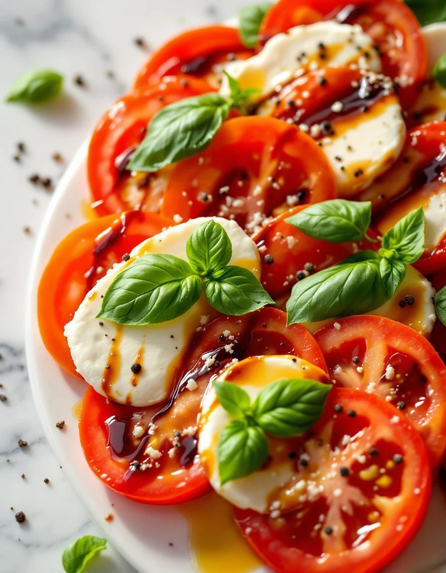 Assembling it is quick, but be ready for the smear of olive oil and the splash of balsamic that soak into the cheese and tomato, creating a little puddle on the plate. It’s all about the tactile contrast—soft cheese, juicy tomatoes, and tender basil.