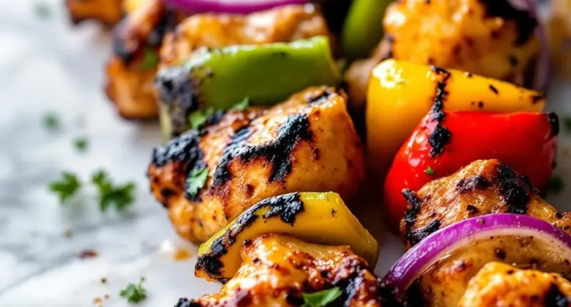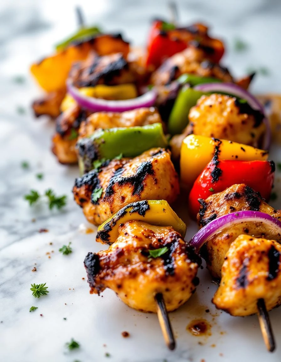 Juicy chicken pieces, marinated in a zesty lemon and spice blend, are threaded onto skewers along with colorful bell peppers, red onions, and herbs. Grilled to perfection, the kabobs develop smoky char marks and tender textures, with flavors that burst with each bite. The final dish showcases vibrant, caramelized vegetables and succulent chicken with a slightly crispy exterior.