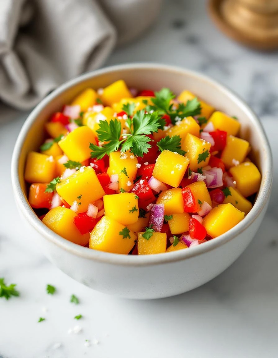 Making mango salsa means peeling and chopping sticky, ripe mangoes that squish a bit under the knife. You’ll also need to finely dice onion and pepper, which can be messy and make your eyes water if you’re not careful.