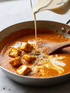 Step 4: Mix in cream, butter, and a splash of water to create a velvety sauce. Gently add the paneer cubes, simmer on low heat (~90°C / 194°F) for 10 minutes, until the flavors meld.