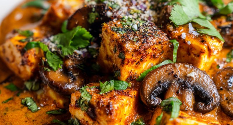 This hearty paneer mushroom masala is a quick, flavorful curry that combines soft, spongy paneer with earthy mushrooms in a fragrant tomato-based sauce. The dish features a rich, velvety texture with a balance of spice and creaminess, making it perfect for a comforting weeknight dinner. It’s cooked using sautéing and simmering methods, resulting in a glossy, aromatic dish that’s as satisfying to look at as it is to eat.