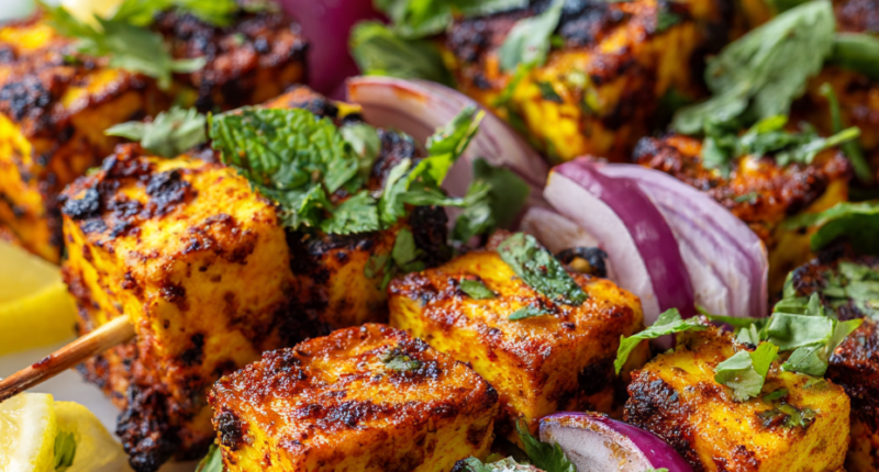 Once grilled, let the paneer tikka rest for 2 minutes off the heat. Serve hot, garnished with fresh coriander and a squeeze of lemon for brightness.
