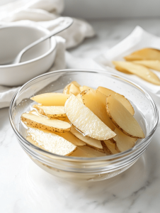 2. Slice the potatoes into thick fries, then soak them in cold water for 10 minutes to remove excess starch, which helps them crisp up.