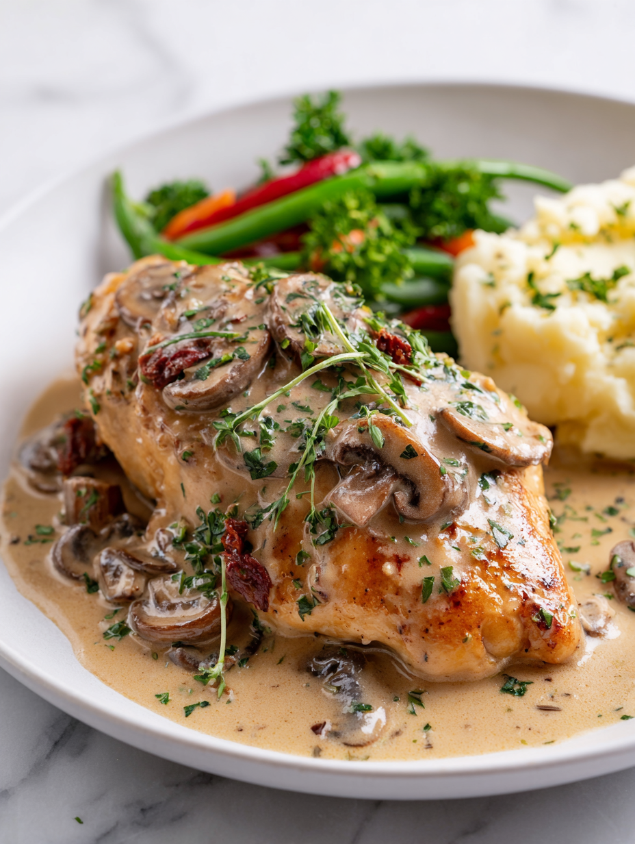 - Garnish with chopped fresh parsley and spoon the luscious sauce and mushrooms over the chicken. Serve immediately with your favorite sides, such as buttery potatoes or crusty bread.