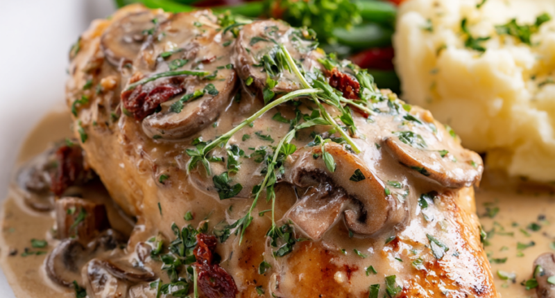 - Garnish with chopped fresh parsley and spoon the luscious sauce and mushrooms over the chicken. Serve immediately with your favorite sides, such as buttery potatoes or crusty bread.