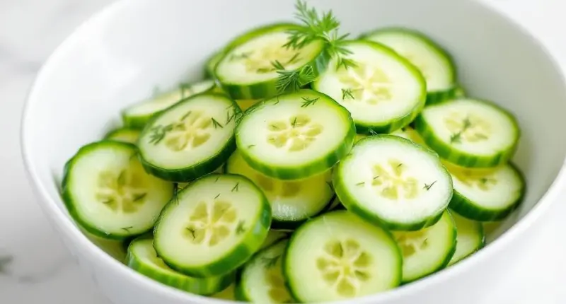 2. Transfer the cucumber slices into a clean mixing bowl, spreading them evenly so they’re ready for dressing.