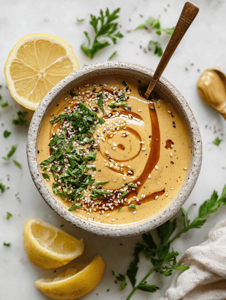 • Tahini: Creamy sesame paste with a rich, nutty flavor—look for smooth, runny tahini for easiest blending.