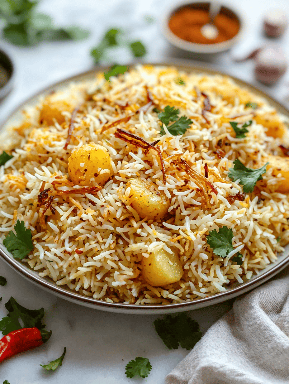 - Gently fluff the potato biryani with a fork, then serve hot, allowing the fragrant spices, tender potatoes, and fluffy rice to shine.