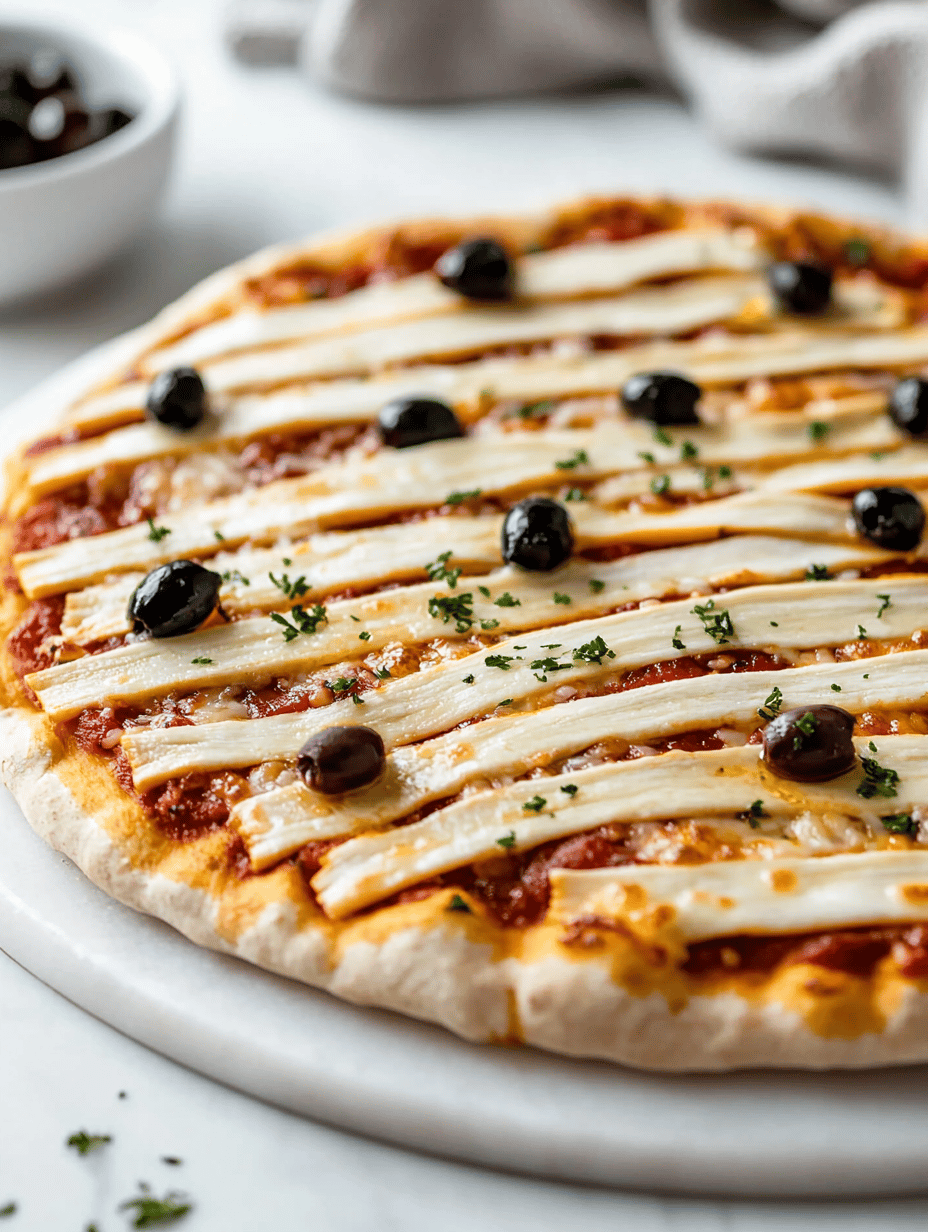 - Once the cheese is bubbly, remove the pizza from the oven. Carefully arrange the pepperoni strips over the cheese in random bandage-like patterns, mimicking the look of wrapped mummy strips.