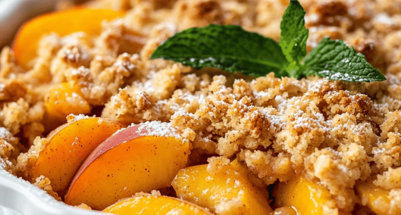 Peach crumble is a baked dessert featuring juicy, sliced peaches topped with a crispy oat and cinnamon streusel. The dish combines tender, caramelized fruit with a golden-brown, crunchy topping, resulting in a warm and rustic final presentation.