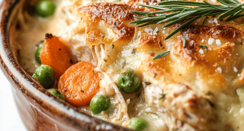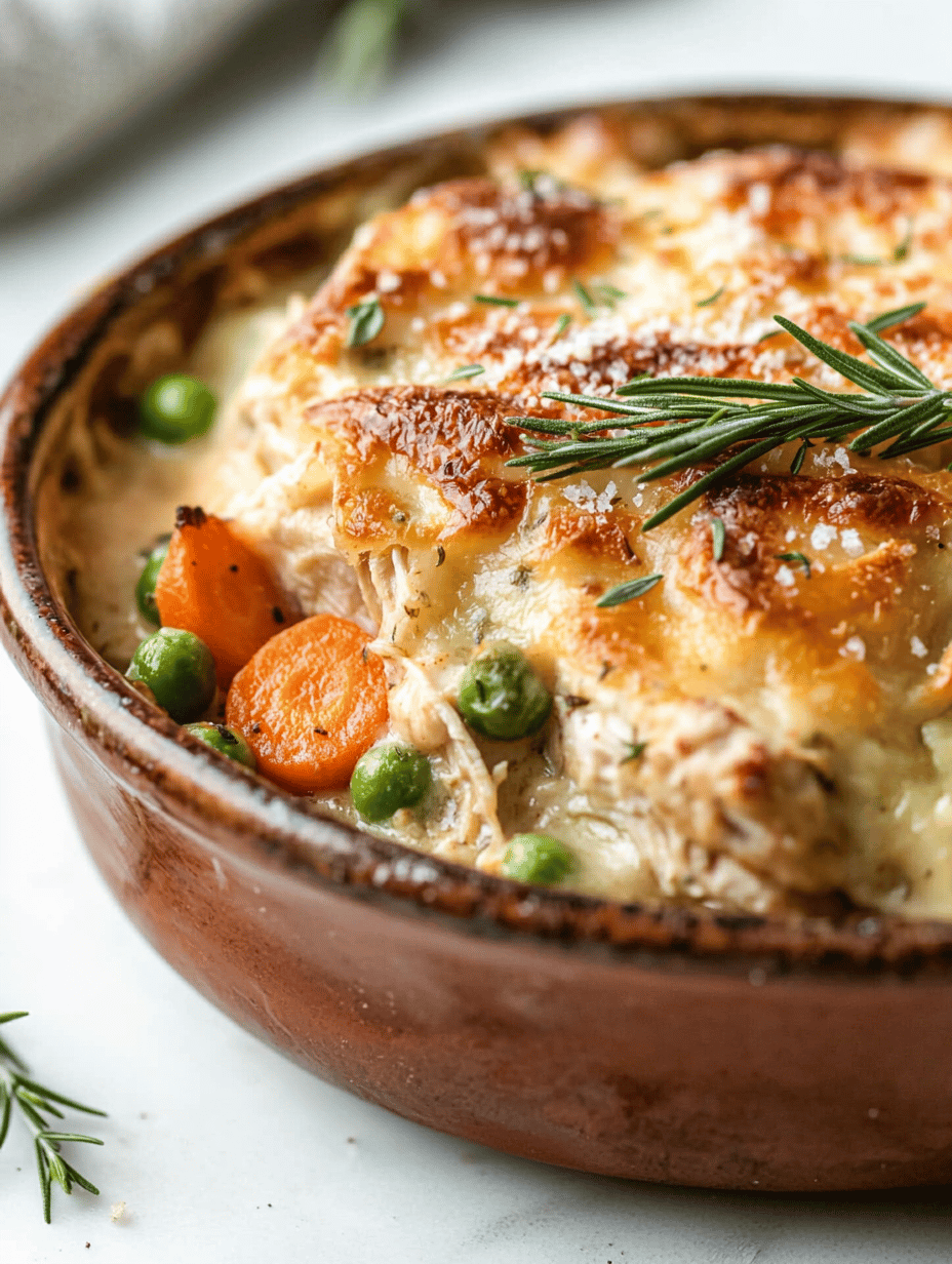 This chicken casserole features tender shredded chicken layered with caramelized onions, roasted herbs, and a smoky fall spice blend. Baked until bubbly with a crispy topping, it offers a hearty and comforting texture with a golden crust and rich, layered flavors.